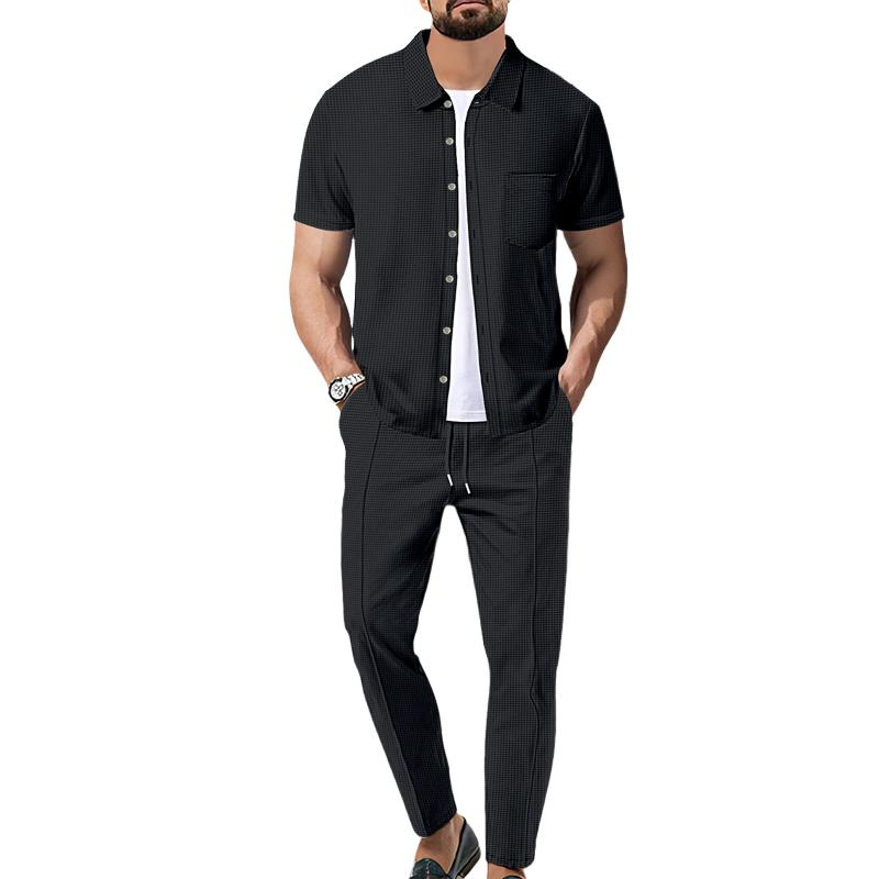 Men's Casual Two-Piece Outfit | Waffle Knit Set | Short Sleeve Shirt & Pants | Solid Color | Elastic Waist | Breathable Fabric | Side Pockets | Comfortable Loungewear | Ideal for Travel & Everyday Wear